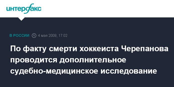 Москва. 4 мая. INTERFAX.RU - Следственный комитет при прокуратуре РФ назначил дополнительное судебно-медицинское исследование в рамках проверки по факту смерти хоккеиста омского "Авангарда" Алексея Черепанова. "В настоящее время в целях более полной и объективной оценки действий врачей в бюро судебно-медицинской экспертизы Минздрава Московской области проводится дополнительное судебно-медицинское исследование, на разрешение которого следователем поставлены вопросы о характере и течении заболевания погибшего спортсмена, в том числе возможности своевременной постановки диагноза - миокардит, основаниях назначения препарата кордиамин и другие исследования", - говорится в сообщении СКП РФ, переданном в понедельник в "Интерфакс".
