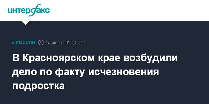 Москва. 15 июля. INTERFAX.RU - Следователи возбудили уголовное дело по факту безвестного исчезновения 14-летнего подростка, проживающего в Козульском районе Красноярского края, сообщает в четверг пресс-служба следственного комитета по региону и республике Хакасия.