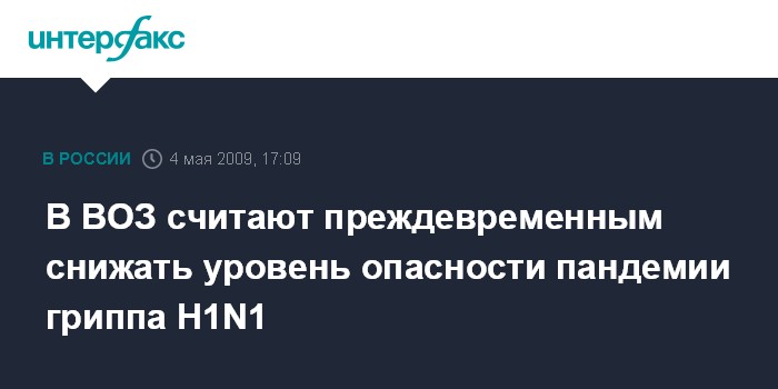 Москва. 4 мая. INTERFAX.RU - Всемирная организация здравоохранения (ВОЗ) пока не планирует менять уровень опасности пандемии гриппа H1N1 в мире с отметки "пять" (из шести возможных).
