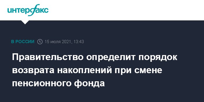 Москва. 15 июля. INTERFAX.RU - Правительство рассмотрит законопроект о порядке порядок возврата пенсионных накоплений гражданам, которые потеряли доход от процентов при досрочном переходе из одного пенсионного фонда в другой, заявил на заседании кабмина премьер-министр Михаил Мишустин.
