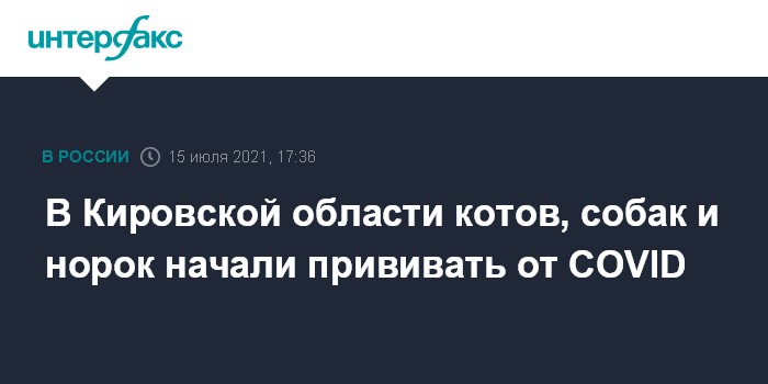 Москва. 15 июля. INTERFAX.RU - Первая партия вакцины против COVID-19 "Карнивак-Ков" для вакцинации животных поступила в Кировскую область, сообщается на сайте управления ветеринарии региона в четверг.