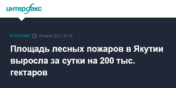 Москва. 16 июля. INTERFAX.RU - Площадь лесных пожаров в Якутии за сутки увеличилась более чем на 200 тыс. гектаров. По данным пресс-службы регионального министерства экологии, утром в пятницу в республике тушат 75 лесных пожаров на площади 740 221,6 гектара, накануне площадь пожаров составляла 529 718,5 гектара.