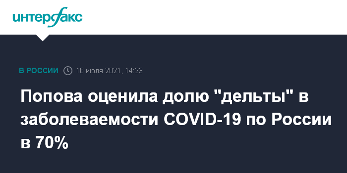 Москва. 16 июля. INTERFAX.RU - В России в структуре заболеваемости COVID-19 доля штамма "дельта" выросла до примерно 70%, сообщила на заседании президиума координационного совета при правительстве по борьбе с коронавирусом глава Роспотребнадзора Анна Попова.