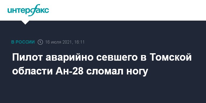 Москва. 16 июля. INTERFAX.RU - Пилот Анатолий Прытков, управлявший самолетом Ан-28, который аварийно сел в Томской области, получил перелом ноги при приземлении, сообщил "Интерфаксу" информированный источник.