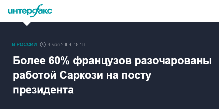 Париж. 4 мая. INTERFAX.RU - Работа президента Франции Николя Саркози не вызывает оптимизма у большинства жителей страны, говорится в опросе "ТНС Софрес Ложика", результаты которого приводит в понедельник местная пресса.