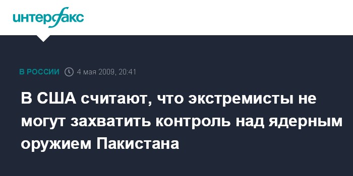 Вашингтон. 4 мая. INTERFAX.RU - Действующие на территории Пакистана экстремисты не в состоянии захватить контроль над ядерным арсеналом этой страны, уверен председатель объединенного комитета начальников штабов США, адмирал Майкл Маллен.