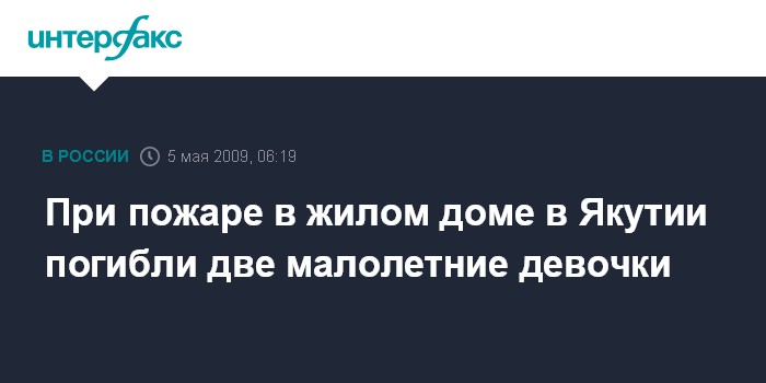 Якутск. 5 мая. ИНТЕРФАКС-ДАЛЬНИЙ ВОСТОК - Оставленные дома без присмотра взрослых две малолетние девочки погибли в результате пожара в доме в селе Арылах Кобяйского района Якутии.