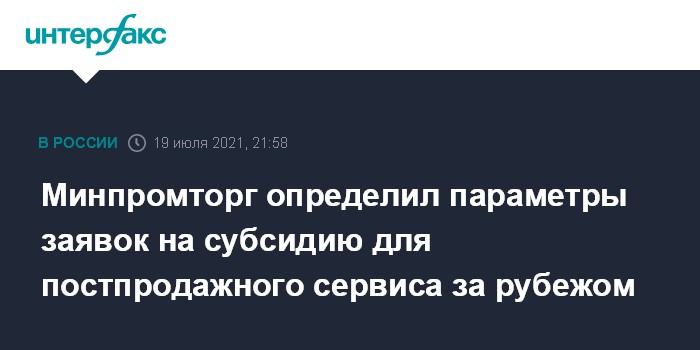 Правительство РФ утвердило правила предоставления субсидий на послепродажное обслуживание экспортируемой продукции 11 июня 2021 года. Сообщалось, что средства можно будет потратить на создание сервисных центров в иностранных государствах, приобретение оборудования для них и подготовку персонала. Максимальный объем субсидии на один проект по сервисному обслуживанию составляет 350 млн рублей, при этом одно промпредприятие может получить до 1 млрд рублей.