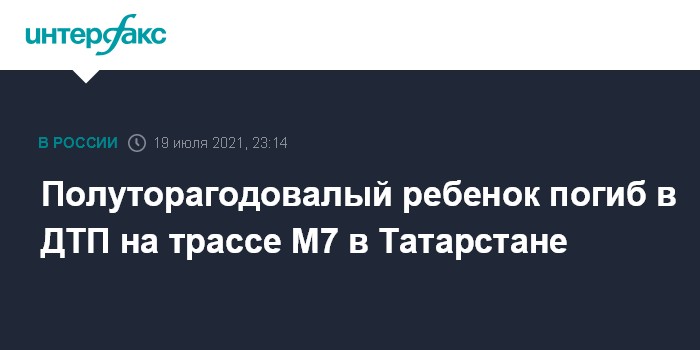 Москва. 19 июля. INTERFAX.RU - Полуторагодовалый ребёнок погиб в дорожной аварии в понедельник на трассе М7 "Волга", еще пять человек с различными травмами госпитализированы, сообщили журналистам в пресс-службе прокуратуры Татарстана.