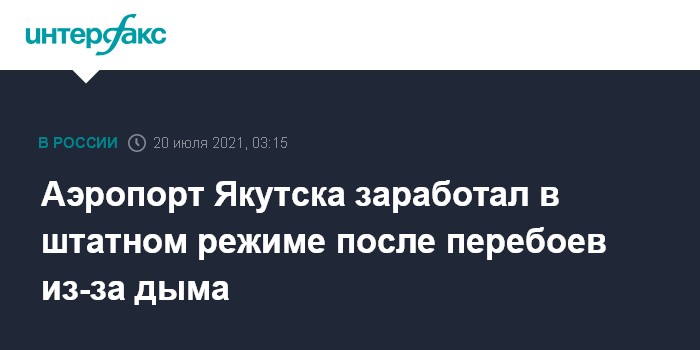 Москва. 20 июля. INTERFAX.RU - Аэропорт Якутска возобновил работу в штатном режиме после перебоев, связанных с низкой видимостью из-за дыма от природных пожаров, сообщил во вторник оперштаб Республики Саха (Якутия).