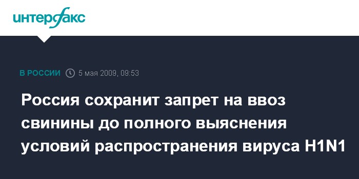 Москва. 5 мая. INTERFAX.RU - Россия, ограничившая с мая импорт свинины из Канады, США и Испании, намерена сохранить запрет на ввоз мяса из этих стран до полного выяснения обстоятельств распространения вируса гриппа H1N1, сообщил "Интерфаксу" пресс-секретарь Россельхознадзора Алексей Алексеенко.