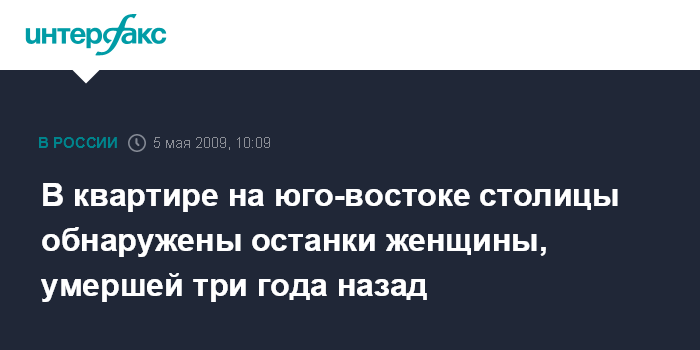 Москва. 5 мая. INTERFAX.RU - В квартире жилого дома в Юго-Восточном округе Москвы обнаружены останки женщины, которая умерла около трех лет назад, сообщил во вторник "Интерфаксу" источник в правоохранительных органах.