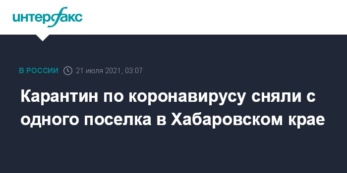 Москва. 21 июля. INTERFAX.RU - Улучшение эпидемиологической ситуации позволило снять ограничения по коронавирусу в поселке на севере Хабаровского края, введенные там в начале июня, сообщает в среду пресс-служба правительства региона.