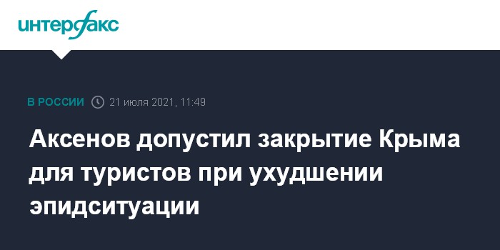 Москва. 21 июля. INTERFAX.RU - Пока власти Крыма не планируют закрыть полуостров для туристов в связи с ухудшением ситуации с коронавирусом. Однако ситуация на грани и если заболеваемость станет катастрофической, то туристический сезон придется закрыть, сказал в региональном оперштабе глава региона Сергей Аксенов.