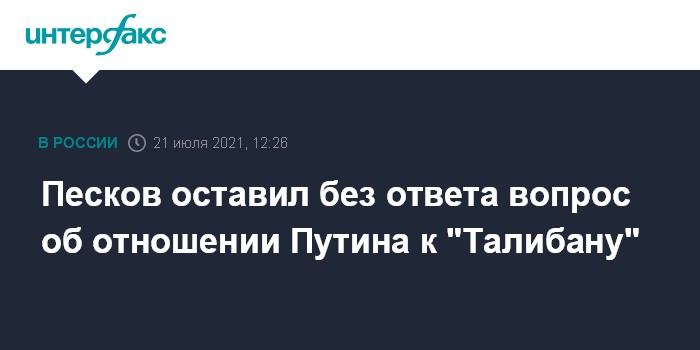 Москва. 21 июля. INTERFAX.RU - В Кремле не стали отвечать на вопрос о позиции президента РФ Владимира Путина в отношении движения "Талибан" (запрещено в России), заявили, что пристально и с обеспокоенностью следят за ситуацией в Афганистане.