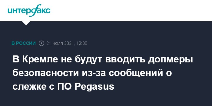 Москва. 21 июля. INTERFAX.RU - В Кремле не видят необходимости принимать дополнительные меры в связи с информацией о слежке за руководителями ряда государств посредством программного обеспечения Pegasus.