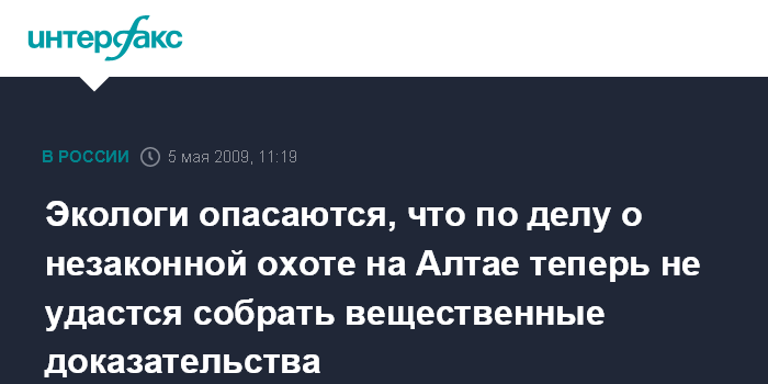 Москва. 5 мая. INTERFAX.RU - Российские экологи поддерживают возбуждение уголовного дела по факту охоты в январе в Горном Алтае на животных, занесенных в Красную книгу, и обещают следить за ходом расследования.