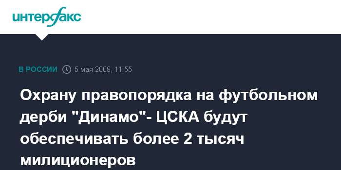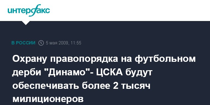 Москва. 5 мая. INTERFAX.RU - Безопасность на стадионе "Арена-Химки", где в воскресенье пройдет матч чемпионата России по футболу между московскими командами "Динамо" и ЦСКА, будут обеспечивать около 2 тысячи сотрудников милиции и военнослужащих ВВ, сообщили "Интерфаксу" во вторник в управлении информации и общественных связей ГУВД Московской области.