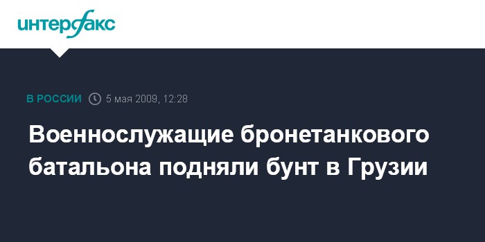 Москва. 5 мая. INTERFAX.RU - Военнослужащие бронетанкового батальона на территории мухрованской воинской части подняли бунт, сообщил во вторник в эфире грузинской телекомпании "Рустави-2" министр обороны Грузии Давид Сихарулидзе.