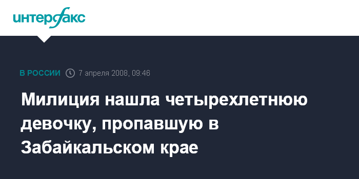 Чита. 7 апреля. INTERFAX.RU - Сотрудники ОВД Балейского района Забайкальского края нашли четырехлетнюю девочку, пропавшую в воскресенье в Шилкинском районе.
