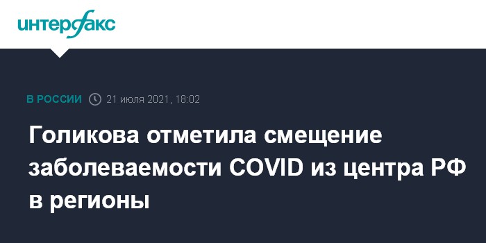 Москва. 21 июля. INTERFAX.RU - Заболеваемость коронавирусом смещается из Москвы и центральной части страны в другие регионы, в 67 субъектах РФ отмечается рост числа заболевших, сообщила вице-премьер Татьяна Голикова.