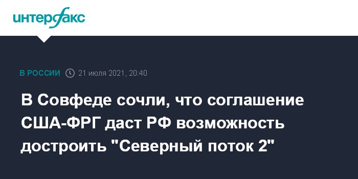 Москва. 21 июля. INTERFAX.RU - Договоренность США и Германии по "Северному потоку 2" дает возможность РФ беспрепятственно его достроить и начать эксплуатацию, заявил первый зампред комитета Совета Федерации по международным делам Владимир Джабаров.