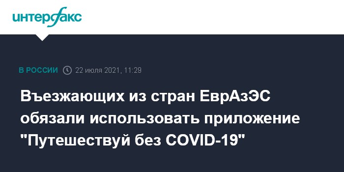 Москва. 22 июля. INTERFAX.RU - Иностранцы, въезжающие в Россию из стран Евразийского экономического союза, с 25 июля будут обязаны использовать приложение "Путешествуй без COVID-19", такое требование ввело российское правительство. Такое постановление опубликовано на официальном портале правовой информации.