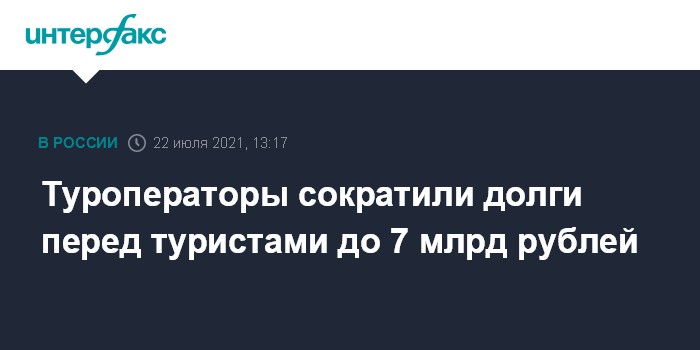 Москва. 22 июля. INTERFAX.RU - Туроператоры сократили задолженность перед туристами, которых они не смогли отправить отдыхать в 2020 году из-за пандемии, более чем в шесть раз, до 7 млрд рублей, до конца года эта цифра сократится еще на 3 млрд рублей, сообщила глава Ростуризма Зарина Догузова.