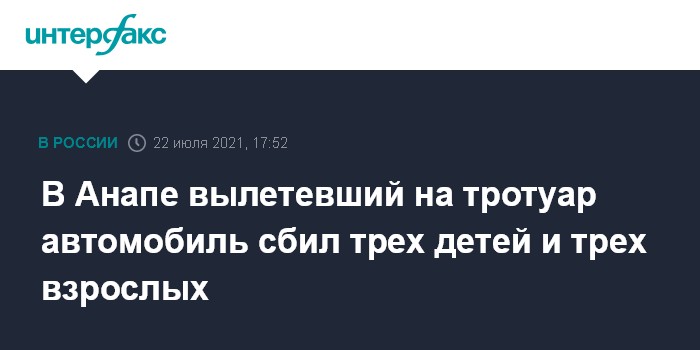 Москва. 22 июля. INTERFAX.RU - Автомобиль сбил пешеходов на тротуаре в Анапе, пострадали шесть человек, включая троих детей. Об этом сообщила пресс-служба прокуратуры Краснодарского края в четверг.