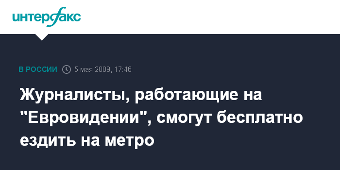 Москва. 5 мая. INTERFAX.RU - Журналисты, официально аккредитованные для работы на конкурсе "Евровидение-2009", могут бесплатно ездить на московском метрополитене, сообщили "Интерфаксу" во вторник в оргкомитете конкурса. Там рассказали, что каждому журналисту выдается билет на метро с лимитом в 70 поездок, который будет действовать все время проведения конкурса по 17 мая.