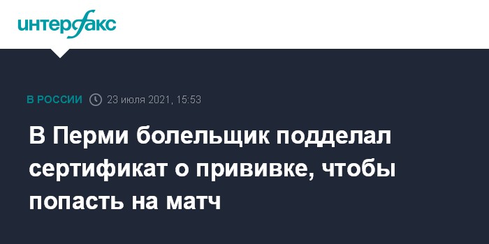 Москва. 23 июля. INTERFAX.RU - Полиция в Перми возбудила уголовное дело в отношении местного жителя, которого подозревают в подделке сертификата о COVID-вакцинации ради посещения футбольного матча, сообщается в пятницу на сайте краевого главка МВД.