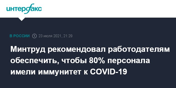 Минтруд рекомендовал работодателям обеспечить, чтобы 80% персонала имели иммунитет к COVID-19