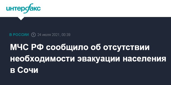 Москва. 24 июля. INTERFAX.RU - Эвакуация населения в Сочи не требуется, сообщили журналистам в пресс-службе МЧС РФ в субботу.