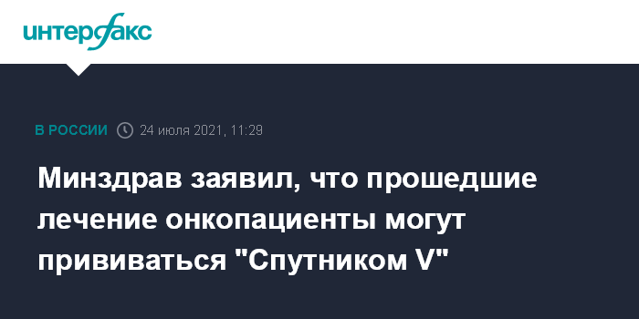 Москва. 24 июля. INTERFAX.RU - Пациенты с онкологическими заболеваниями, прошедшие противоопухолевое лечение, могут быть привиты вакциной от коронавируса "Спутник V" без ограничений, следует из новых методических рекомендаций Минздрава РФ по проведению вакцинации от COVID-19.