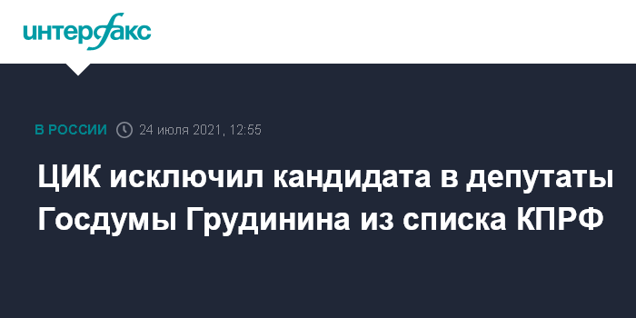 Москва. 24 июля. INTERFAX.RU - Центризбирком России в субботу исключил кандидата от КПРФ на выборах в Госдуму Павла Грудинина из федерального списка из-за наличия у него активов в иностранной компании.