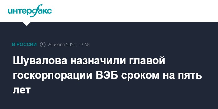 Москва. 24 июля. INTERFAX.RU - Глава ВЭБа Игорь Шувалов вновь назначен руководителем этой госкорпорации сроком на пять лет. Соответствующий указ президента России Владимира Путина размещен на официальном портале правовой информации в субботу.