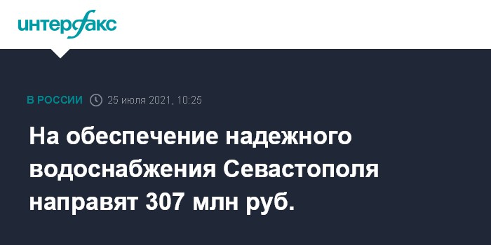 Москва. 25 июля. INTERFAX.RU - На обеспечение стабильного водоснабжения Севастополя будет направлено дополнительно 307,3 млн рублей.
