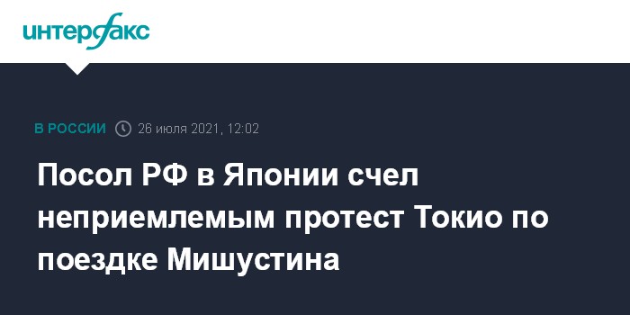 Москва. 26 июля. INTERFAX.RU - Россия считает неприемлемым протест Японии в связи с посещением российским премьер-министром Михаилом Мишустиным острова Итуруп, заявил посол РФ в Токио Михаил Галузин.