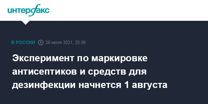 Москва. 26 июля. INTERFAX.RU - Эксперимент по маркировке дезинфицирующих средств и кожных антисептиков в РФ пройдет с 1 августа текущего года по 31 августа 2022 года. Соответствующее постановление, подписанное премьер-министром РФ Михаилом Мишустиным, опубликовано в понедельник на официальном портале правовой информации.