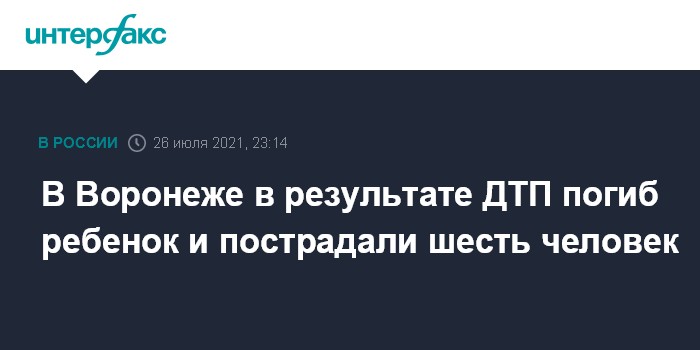 Москва. 26 июля. INTERFAX.RU - Один ребенок погиб, шесть человек, в том числе двое детей, пострадали в аварии с участием двух автомобилей в Воронеже, сообщает в понедельник пресс-служба Главного управления МВД по региону.
