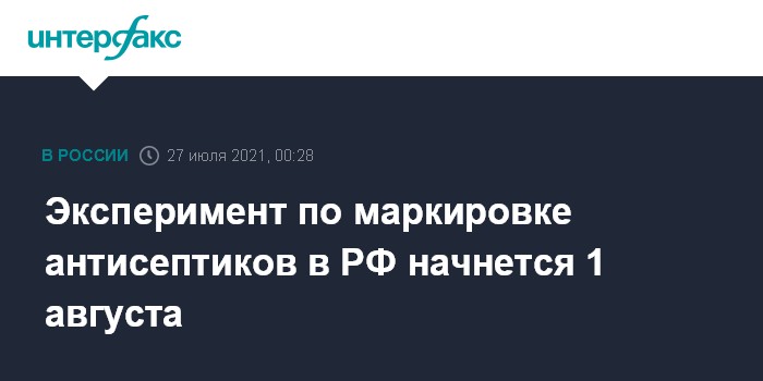 Москва. 27 июля. INTERFAX.RU - Эксперимент по маркировке дезинфицирующих средств и кожных антисептиков в РФ пройдет с 1 августа текущего года по 31 августа 2022 года. Соответствующее постановление, подписанное премьер-министром РФ Михаилом Мишустиным, опубликовано в понедельник на официальном портале правовой информации.