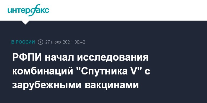 Москва. 27 июля. INTERFAX.RU - Российский фонд прямых инвестиций (РФПИ) ведет совместные клинические исследования по комбинации первого компонента вакцины от коронавируса "Спутник V" с рядом вакцин зарубежного производства, сообщила в ночь на вторник пресс-служба фонда.