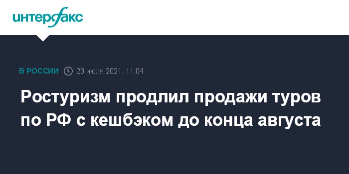 Москва. 28 июля. INTERFAX.RU - Ростуризм сообщил о продлении на месяц текущего этапа продаж туров по России с кешбэком, который должен был закончиться 31 июля.