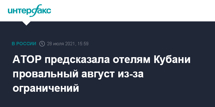 Москва. 28 июля. INTERFAX.RU - В августе ожидается спад продаж туров с заселением в отели Краснодарского края на 15-34% из-за ограничений, связанных с коронавирусом, сообщили в Ассоциации туроператоров России.