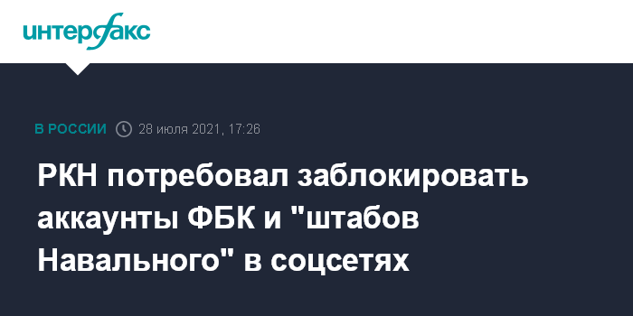 Москва. 28 июля. INTERFAX.RU - Роскомнадзор направил соцсетям требование о блокировке аккаунтов признанных в РФ экстремистскими организаций "Фонда борьбы с коррупцией" (также признан в РФ иноагентом), основанного оппозиционером Алексеем Навальным, "Фонда защиты прав граждан" (ФЗПГ) (также признан в РФ иноагентом) и общественного движения "Штабы Навального" (деятельность всех трех запрещена в РФ), их отделений и организаторов, сообщили "Интерфаксу" в ведомстве.