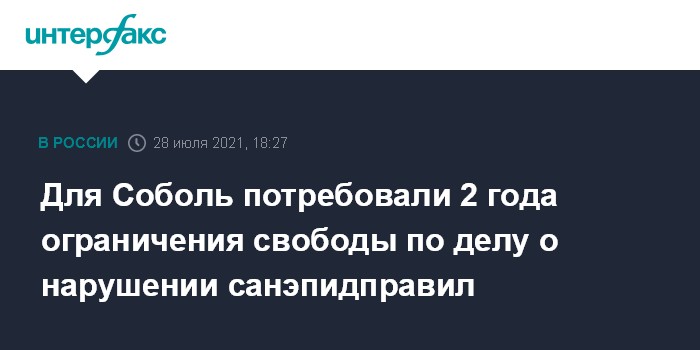 Москва. 28 июля. INTERFAX.RU - Гособвинитель попросил назначить два года ограничения свободы юристу "Фонда борьбы с коррупцией" (ФБК, признан в РФ экстремистской организацией) Любови Соболь по делу о подстрекательстве к нарушению санитарно-эпидемиологических правил в ходе несанкционированной акции 23 января в Москве.