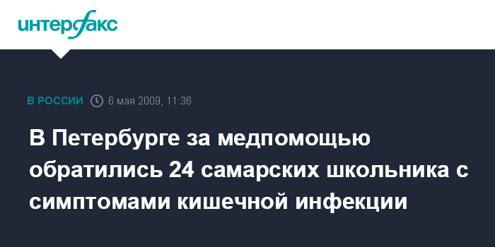 Москва. 6 мая. INTERFAX.RU - В Петербурге за медицинской помощью обратились 24 находящихся в городе самарских школьника с симптомами кишечной инфекции, сообщили "Интерфаксу" в ГУ МЧС города.