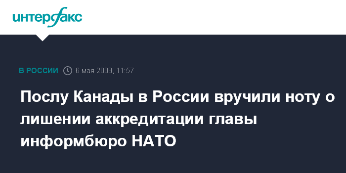 Москва. 6 мая. INTERFAX.RU - Посол Канады в России Ральф Лисишин был приглашен в МИД РФ в среду в 10:30 мск, сообщил источник во внешнеполитическом ведомстве. "Послу была вручена нота о лишении аккредитации главы информбюро НАТО Изабель Франсуа и еще одного сотрудника ее офиса", - сказал источник "Интерфакса" в среду.