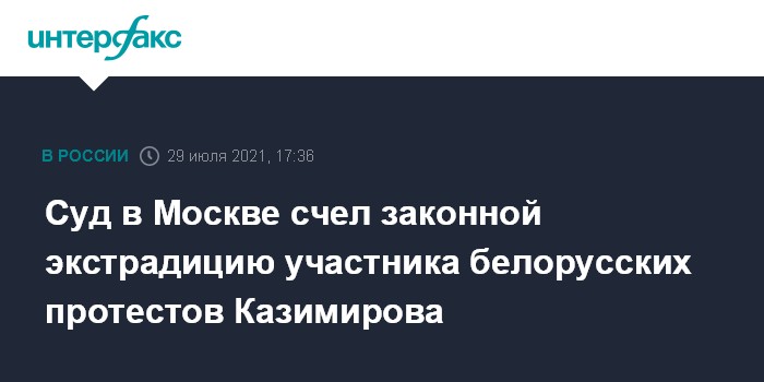 Казимиров был задержан в России в январе текущего года. В конце мая Мосгорсуд принял решение о его экстрадиции в Белоруссию.