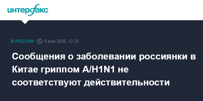 Москва. 6 мая. INTERFAX.RU - Информированные российские и китайские источники опровергли сообщения некоторых СМИ о возможном заболевании гражданки РФ в Китае гриппом A/Н1N1. "Мы проверили информацию и со всей ответственностью можем заявить, что она полностью не соответствует действительности", - сказал агентству "Интерфакс-Китай" источник близкий к медицинским кругам Китая.